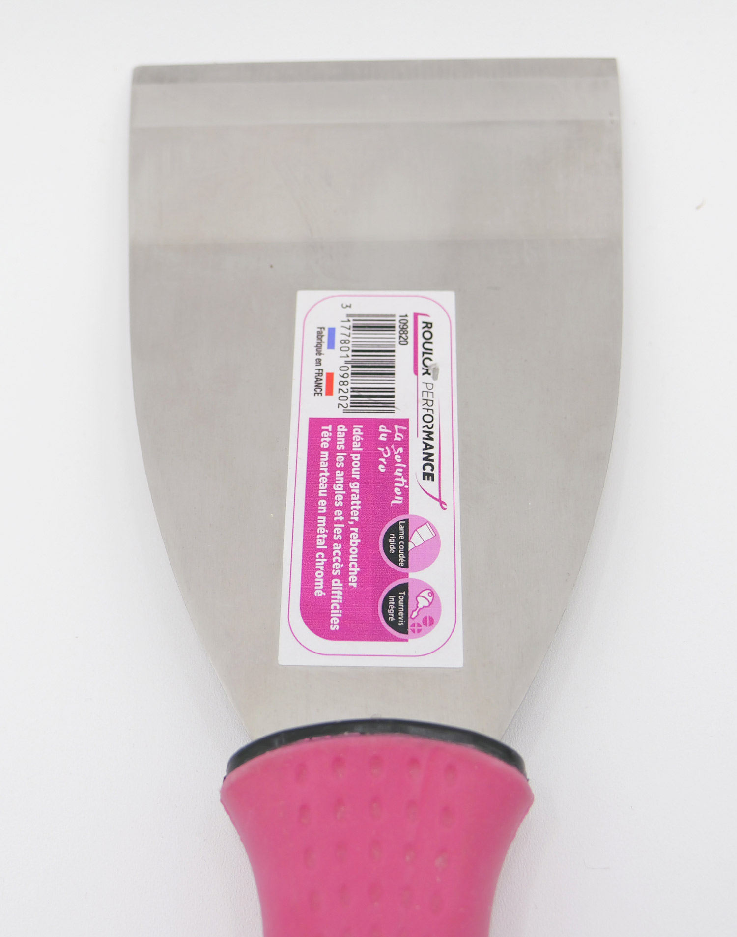 Ce couteau possède une lame rigide en inox trempée, rectifiée, polie miroir, affûtée en large biseau et coudée à 20° pour permettre de dégager la main du support. Ce qui en fait un outil idéal pour gratter des murs, des plafonds, des menuiseries ...