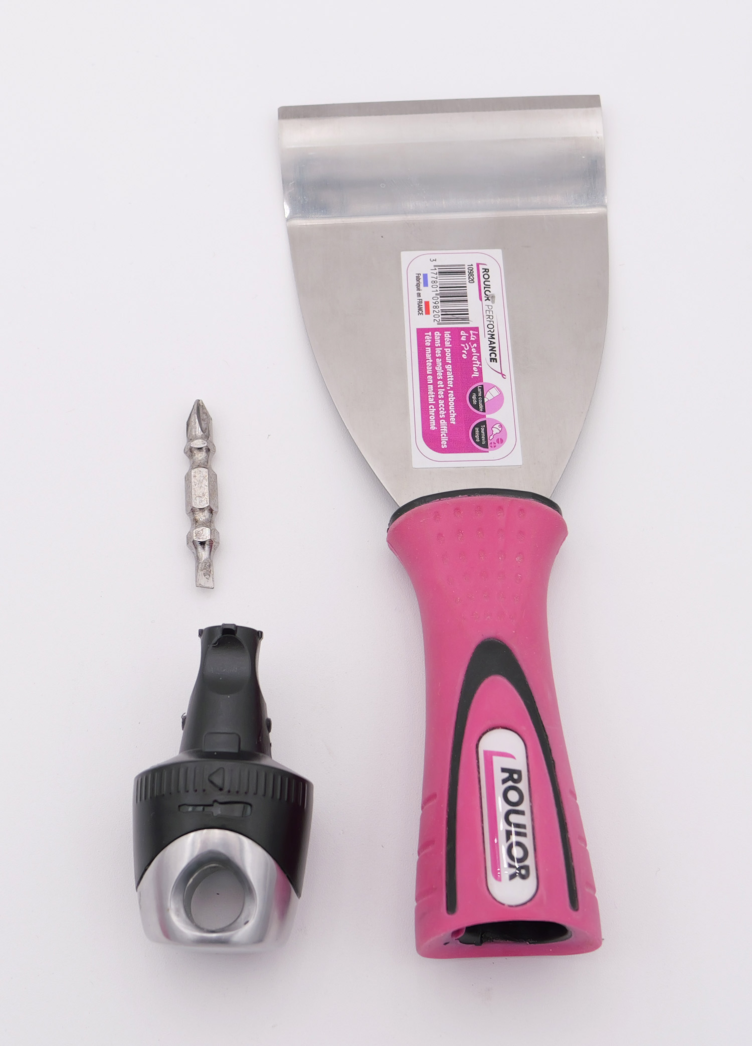 Son manche bi-matière est ergonomique pour un confort optimal de travail, idél pour une utilisation prolongée et sans fatigue de la main. Son embout en métal chromé est démontable et contient un tournevis plat et cruciforme.